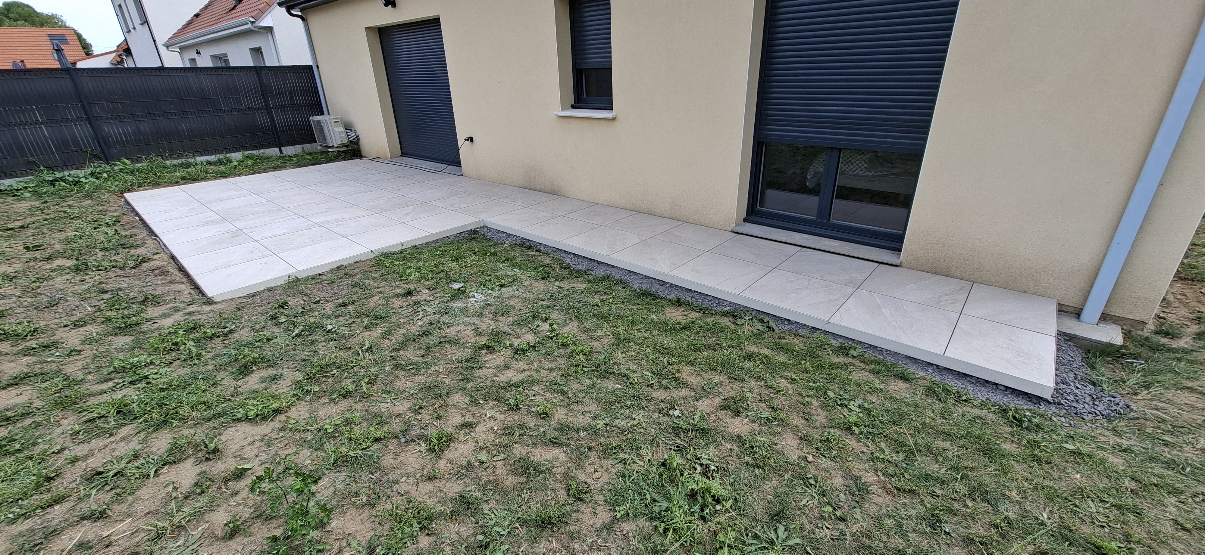 – Octobre 2024 : Massif de rosiers – Aout 2025 : Terrasse sur plot en dalle de 60×60